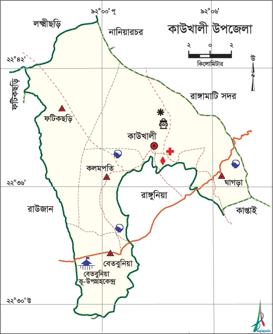 কাউখালী উপজেলাটি ভৌগোলিক দিক থেকে ২২ ডিগ্রী ২৯ মিনিট হতে ২২ ডিগ্রী ৪৪ মিনিট উত্তর অক্ষাংশে ৯১ ডিগ্রী ৫৬ মিনিট হতে ৯২ ডিগ্রী ৮০ মিনিট পূর্ব দ্রাঘিমাংশে অবস্থিত। চার ইউনিয়ন বিশিষ্ট কাউখালী উপজেলার পূর্বে রাঙ্গামাটি সদর ও কাপ্তাই , পশ্চিমে- ফটিকছড়ি ও রাউজান, উত্তরে- নানিয়ারচর ও লক্ষীছড়ি, দক্ষিণে- রাঙ্গুনীয়া ও রাউজান উপজেলা।